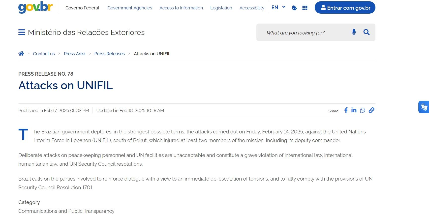O governo do Brasil condenou os ataques ocorridos em Beirute, em 14 de fevereiro contra a Força Interina das Nações Unidas no Líbano (UNIFIL), em comunicado oficial emitido pelo Ministério das Relações Exteriores. O incidente resultou no ferimento do vice-comandante da missão, depois que um comboio transportando tropas para o Aeroporto Internacional de Beirute foi atacado.