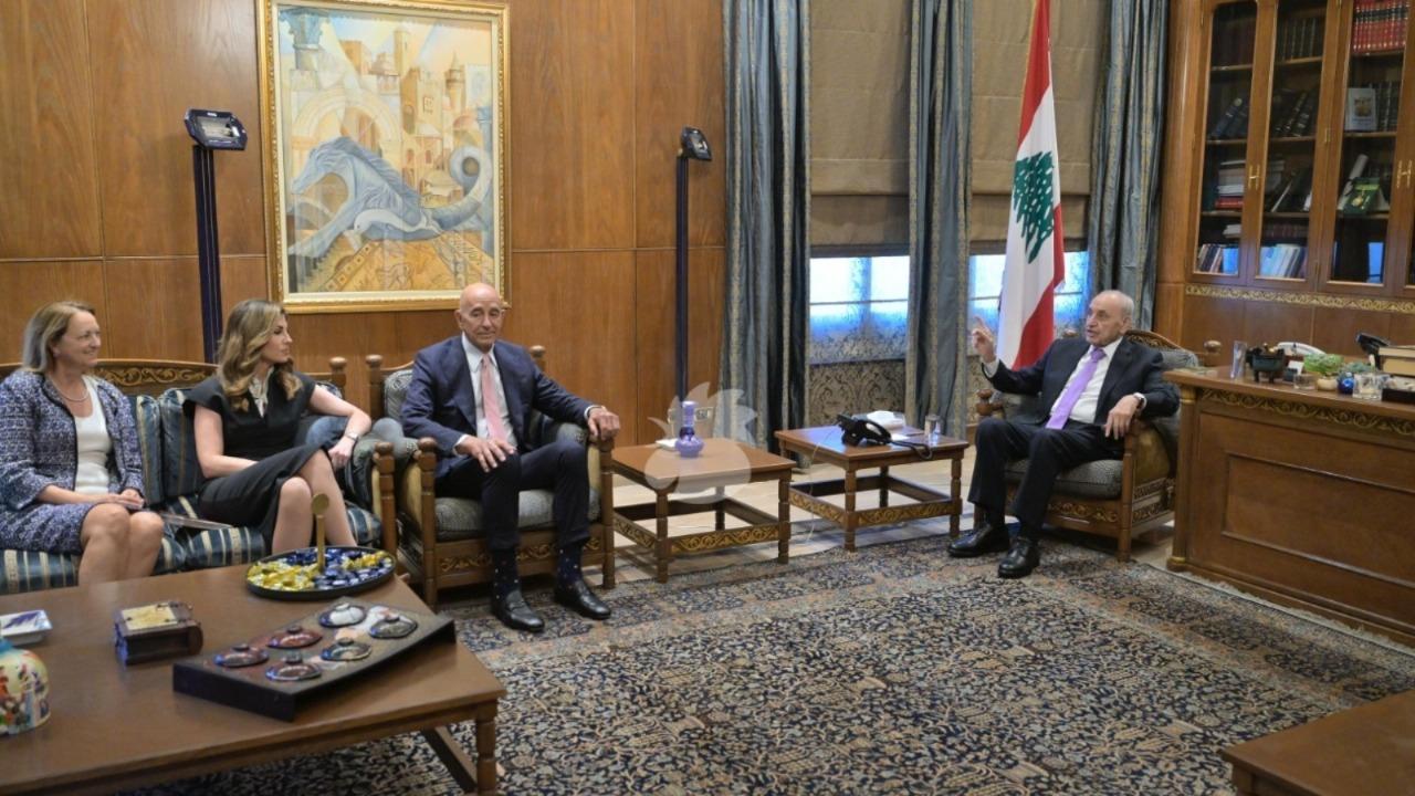Nabih Berri, presidente do Parlamento libanês, se encontra com os enviados dos EUA Tom Barrack e Morgan Ortagus na capital libanesa, Beirute, para discutir questões políticas relacionadas às armas do Hezbollah. Imagem: Parlamento libanês